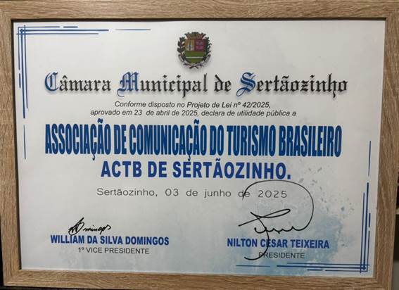 A Câmara Municipal de Sertãozinho concedeu na noite de 3 de junho de 2025 o Título de Utilidade Pública a Associação de Comunicação do Turismo Brasileiro – ACTB.